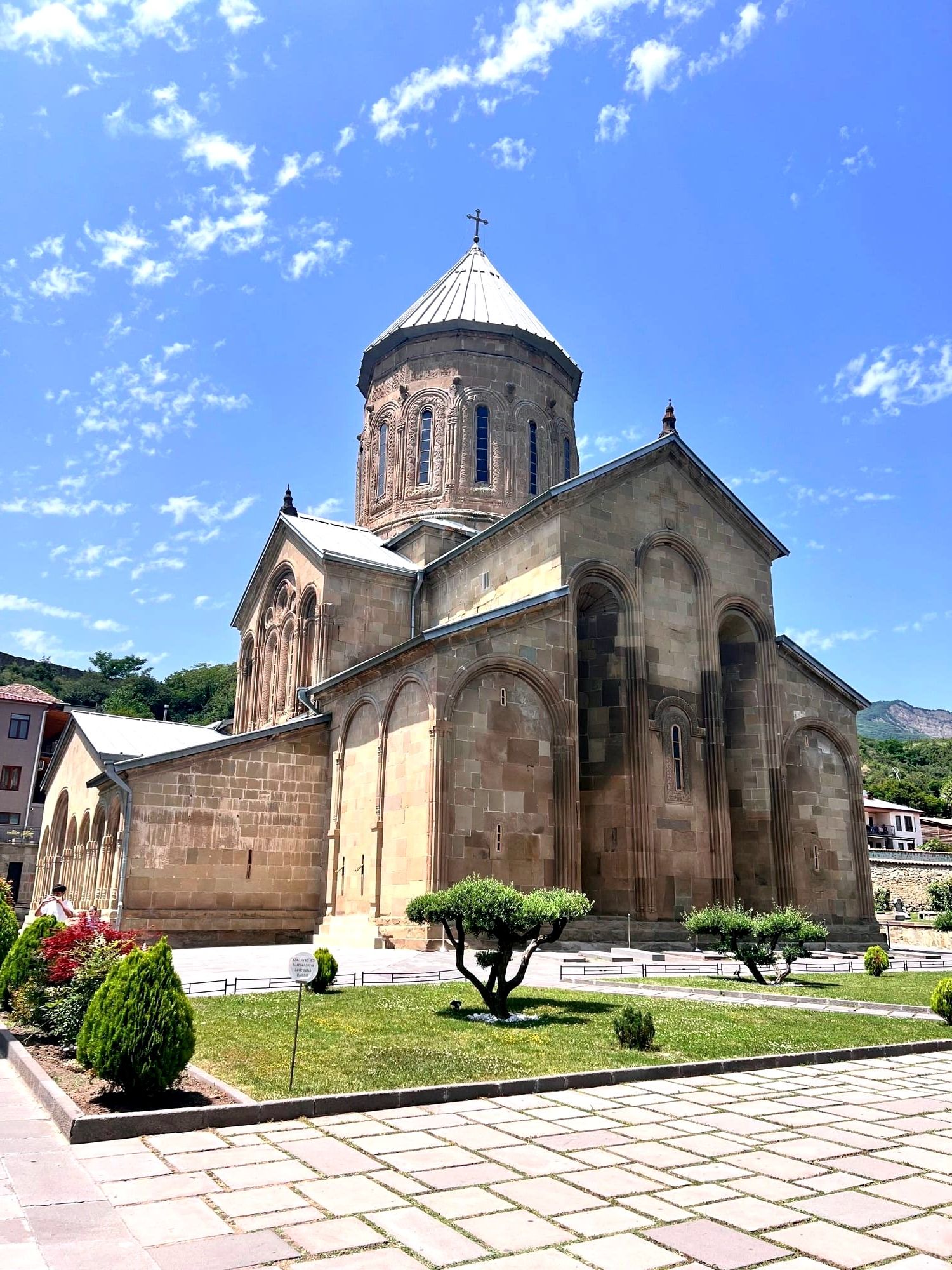 As I walked through the ancient church, ‘The Svetitskhoveli,’ one of the most beautiful churches in Georgia, ornate gate walls of the church, a mix of fresh greenery and rusted church smells hit me like a dream. The vivid hues of pink and green were balanced out with mere shades of brown. The large, gold cross on the top reflected off all of the rays of sunlight into oblivion. When creating this church, architect Arsukidze clearly knew what he was doing. Unfamiliar looks of aging limestone and granite made the church look even more unique. With the utmost precision, tiles were placed on the floor like pieces fitted into a Jigsaw puzzle. Rising majestically into the sky, was the central dome, creating an awesome aura. The interior of the church was unmatched to the outside. The entire interior was covered in bright paintings that represented the story of the Bible, each one having a different meaning than the other. The once sparkling bell rang, which symbolized the time that people gathered and prayed. With each bell ring, the vibration rang through the air