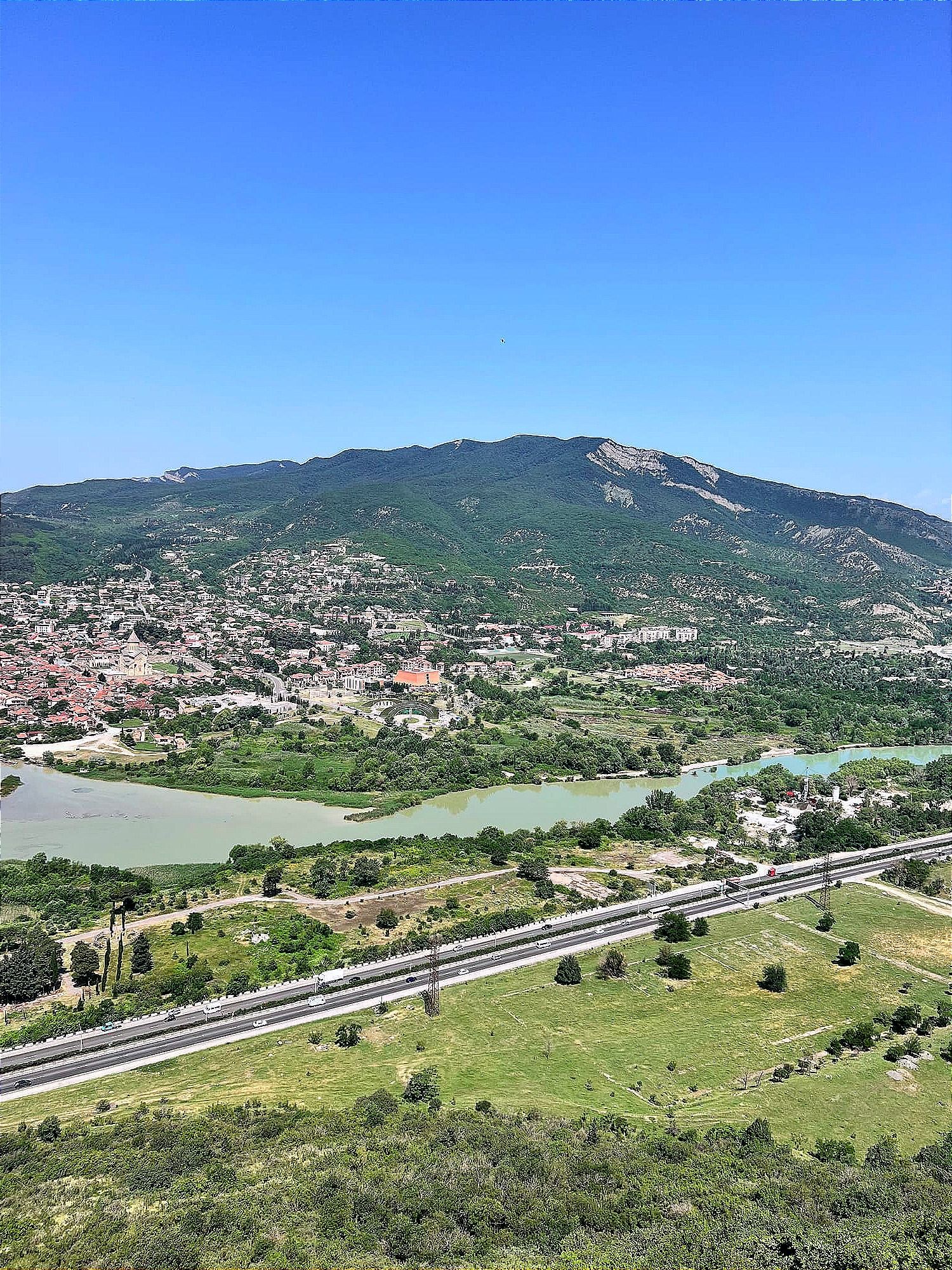 The ride to this Monastery was a long one, with roads that weren’t developed as much as the ones in the city. However, once we reached the rocky mountain top, the view paid off of the ride. The church was 656 meters above sea level. What made it even more interesting was that the church was isolated away from civilization it appeared above and away from the Earth. As I looked over the church wall, I could see a huge valley which looked as if a blanket of trees covered the entire thing. At the foot of The Valley, the Mtkvari and the Aragvi rivers met, which caused a confluence of the two rivers. The river resulted in a hazy greenish-blue color, which was probably from soaking in all the greenery from the valley surrounding the river. Ancient, rusted steps welcome you to the church, giving a picture of how old this church was.The Jvari Monastery is a sixth-century Georgian Orthodox Monastery near Mtskheta. Pale and wooden doors of the monastery were cracked and ruptured, so I could tell what the interior of the church would look like. As I stepped into the church, a cooling breeze brushed past my face. The darkness of the church took a little while to accommodate, but after my eyes adjusted, the beauty and height of the church caught my eye. The church was colossal, and the vivid paintings on the wall were depicting different scenes in the Bible. The interior completely juxtaposed the exterior. The inside looked really bright and modern, as if it was built not too long ago, however, the outside looked as if someone had physically wrecked the monument and left it as it was.