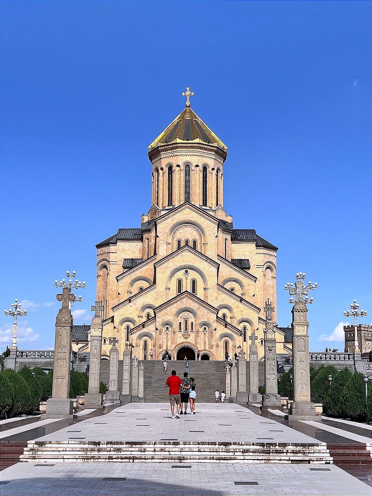 The Holy Trinity Cathedral of Tbilisi may have been the largest and most elegant cathedral I have ever been in. Only built in 2004, this church does not show any signs of age. There were three buildings to this cathedral- which is why the name of the church is called ‘Holy Trinity’. Flights of stairs welcomed us to the cathedral with five crosses on each side of the stairs directing us to the church. The church grew more colossal at each step we took. The roof of the biggest dome of the church was gold, reflecting all the sun’s rays into space. The cross on the roof may even be bigger than me! One building to the left of the cathedral was a bell building. The bell was at the very top of the tower, which was probably twice the size of a normal bell. I can’t believe someone used to go up there every morning and ring that massive bell. The third building to the right of the church was another entrance to the cathedral, only bigger and welcoming. It was a gate in the shape of a double arch and was about 20 feet high up in the air. The gate was the only building in this compound that showed some sign of age. It had some cracks and rusted paint on it, the rest of the building looked as new as a baby. I wasn’t allowed to go inside the church because of what I was wearing, but from the outside, I could tell that it would be just as elegant and beautiful as the outside. There was an aura of purity and sublimity about the church which made it appear out of this world.