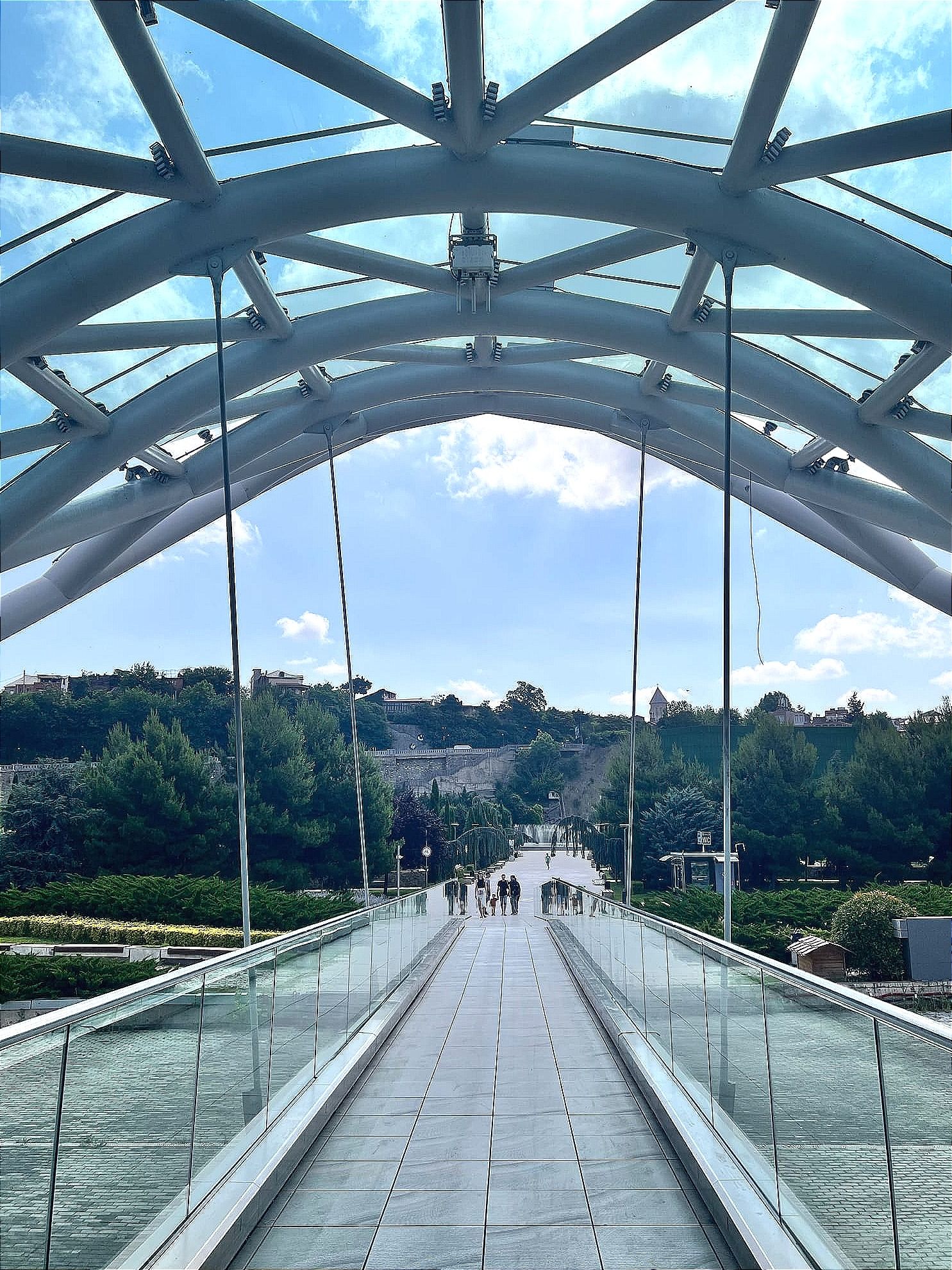 ‘The Bridge of Peace’, which was about a five minute walk from our hotel, connected the Old Town of Tbilisi with the central part of Tbilisi. There were steel ropes attached to large metal poles in the shape of a bow. During the night, the glass on the sides of the bridge got illuminated with numerous lights. The lights get reflected off the Kura river into the sky, producing a light show that one could never miss. On the other end of the bridge, a park sat in a valley with lush greenery and salt air everywhere. Every morning, I embarked on a new journey: the autumn chill refreshed me ; and the gold leaves left a satisfying ‘crunch’ after you walked on it. I would want to sit there forever, watching the yet to grow Wisteria flowers bloom right in front of me.While walking on the bridge, I had a chance to admire the panoramic view of the old cobblestoned old town that takes every tourist back into the ancient world. It was the kind of cold that fogs up glass, but I felt it once I walked towards the other end of the bridge.